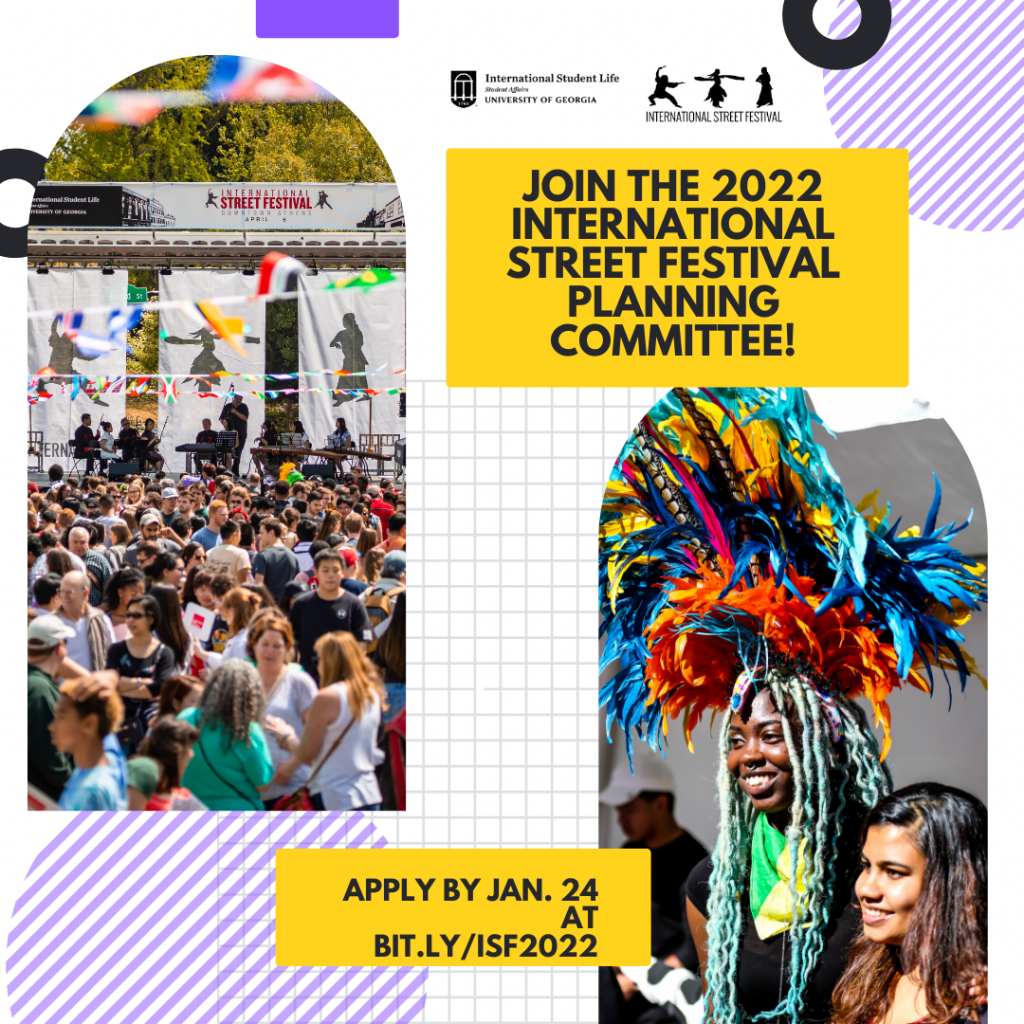 The International Street Festival (also known as ISF or Street Fest) was created in 1999 and is an annual event that promotes internationalization and cultural awareness within the Athens community. The Festival is student and family friendly and boasts an attendance of 3,000-5,000 visitors each year. Various UGA student groups and community organizations host exciting cultural displays and performances throughout the Festival, which typically occurs in downtown Athens each spring. For more information, please email us at isl@uga.edu